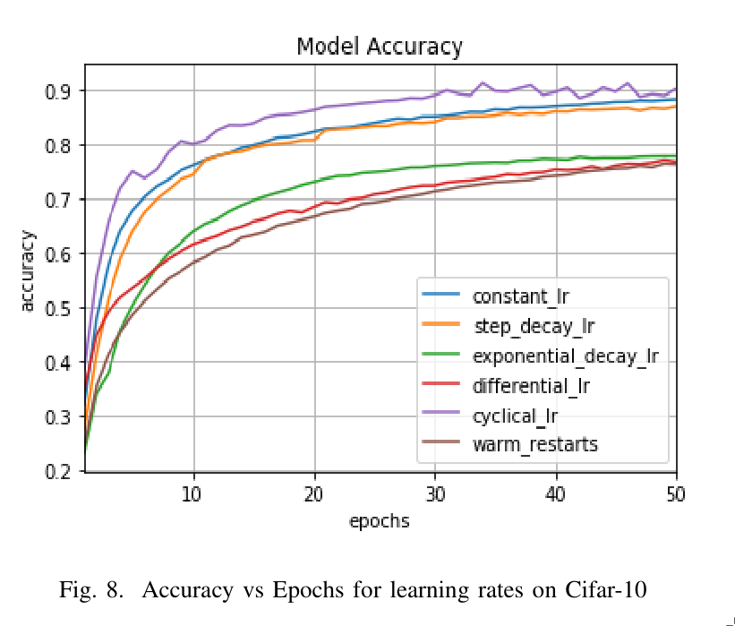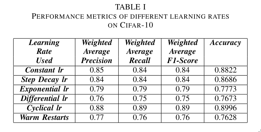 There are different strategies for selecting the initial learning rate — for instance, choosing a random value, or starting with a high learning rate and gradually lowering it over time. This paper investigates the latter approach: how the learning rate can be changed during training, and how various scheduling techniques compare to each other.