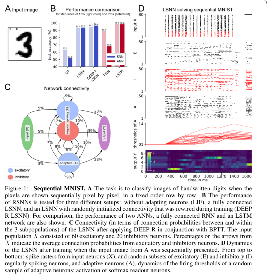 Short Abstract: In this paper, the authors train recurrent networks of spiking neurons (RSNNs) and compare them to other models. For training, they use backpropagation through time (BPTT) and a synaptic rewiring method called DEEP R. The resulting network is referred to as an LSNN. They also test their architecture on learning-to-learn (L2L) schemes.