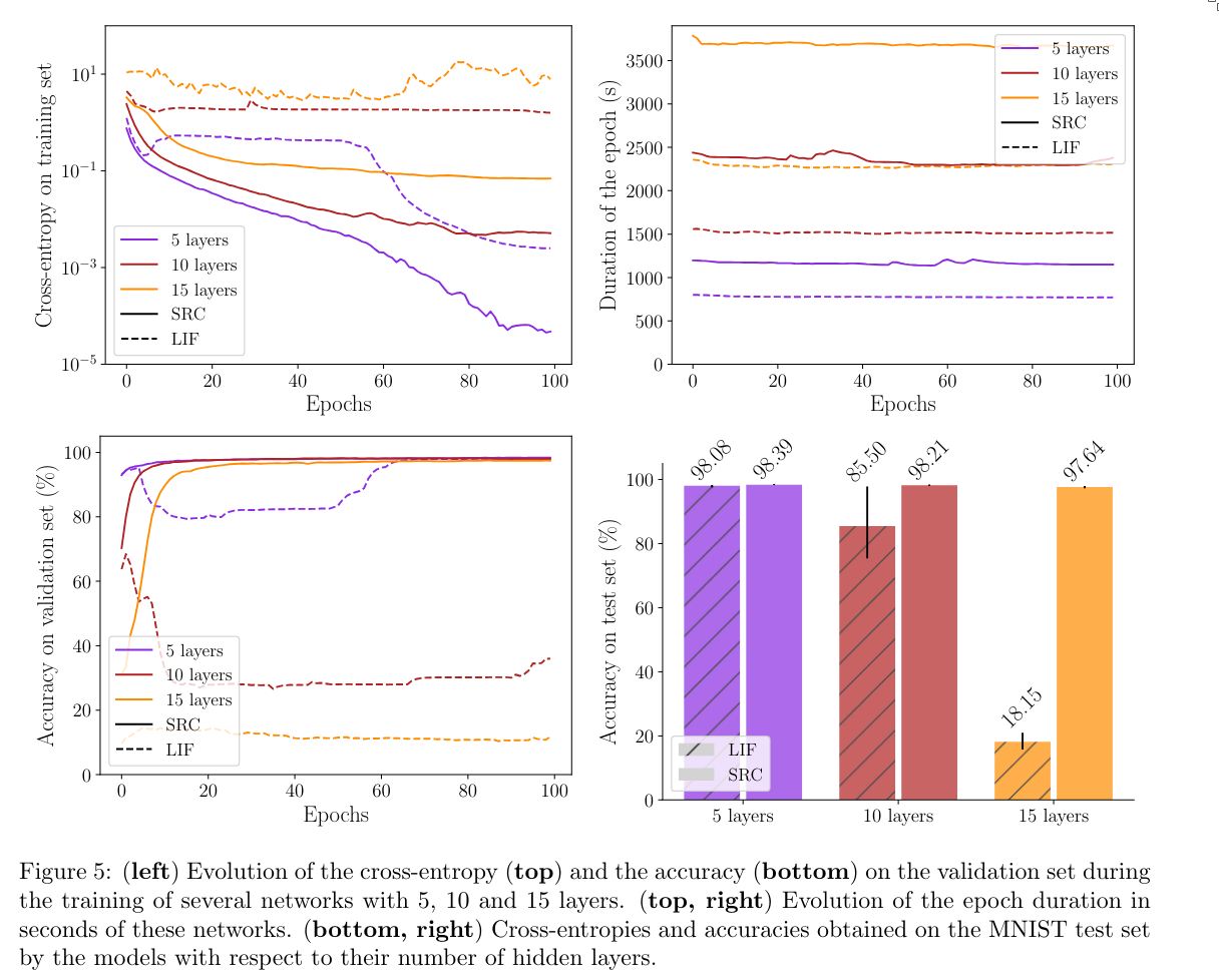 - In deep networks (many layers), SRC vastly outperforms LIF, since LIF fails to learn.