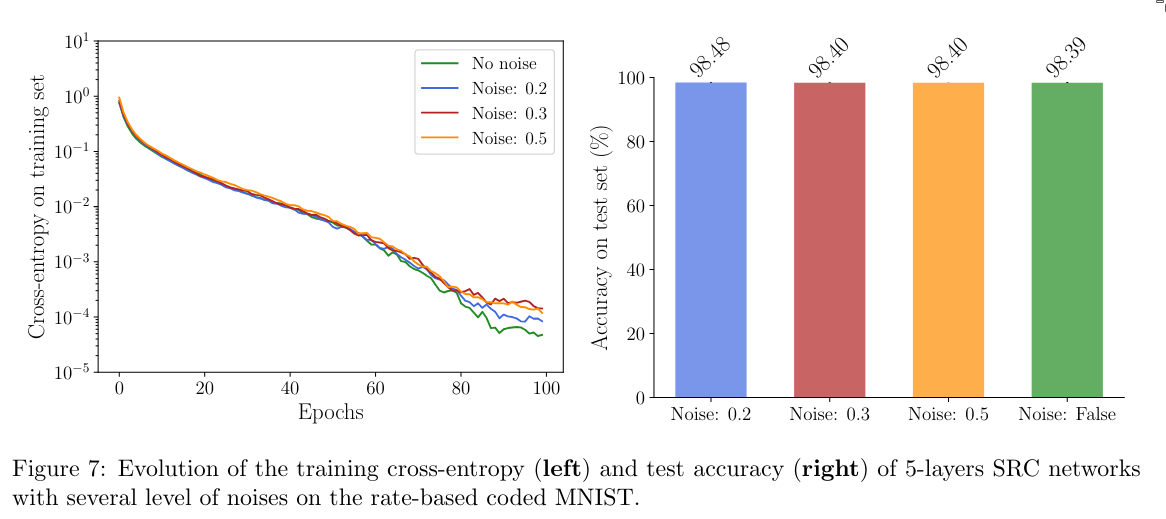 - Adding noise to the parameters does not lead to model collapse. Thus, it can be assumed that SRC networks do not rely on the non-binary shape of their spikes.