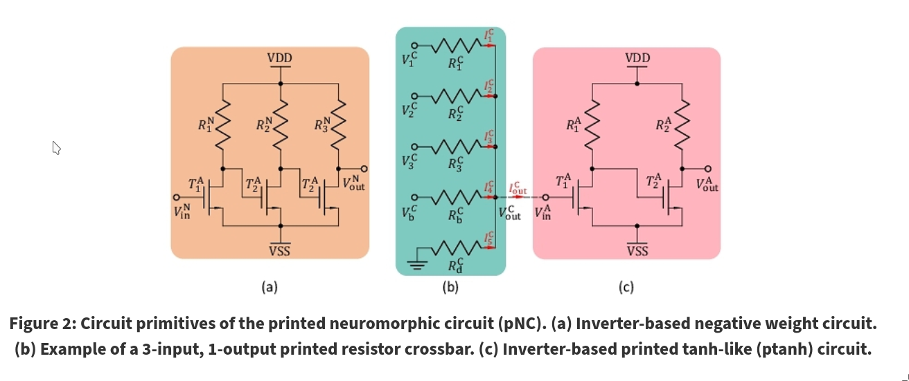 By appropriately designing and printing the conductances, desired weights and biases can be achieved. Importantly, weights are limited to being less than 1 and positive because resistances can only be positive. To achieve negative values for weights or biases, inverter-based negative-weight circuits are required.