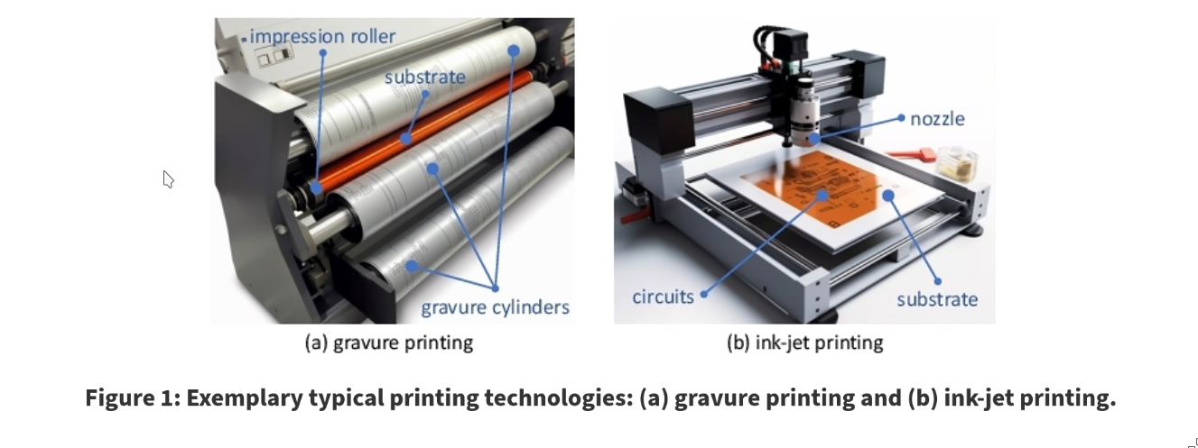 Printed electronics (PE) is an additive manufacturing process that works by depositing functional inks onto a substrate. In contrast to lithography, it is lower in cost because the required equipment and process are less complex.